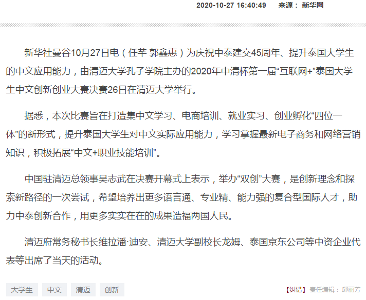上一条:人民网-国际频道 2020-10-28 泰国举办 “互联网+”泰国大学生中文创新创业大赛 下一条:人民网 2020-09-29 2020“创新与实践”东南亚国际汉语教育研讨活动(清迈站)暨泰国北部本土汉语教师培训成功举办