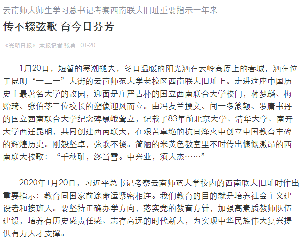 上一条:云南网 2021-01-20 《光明日报》头版报道:这一年来,云南师大全体师生牢记习近平总书记的殷殷重托 传不辍弦歌 育今日芬芳 下一条:云南网 2021-01-18 今天,西南联大旧址举行了一堂特殊的思政课