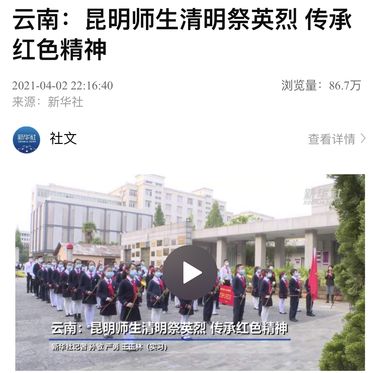上一条:新华社 2021-04-01 昆明部分师生参加清明祭扫活动 接受爱国主义教育 下一条:云视新闻 2021-04-08 奋斗百年路 启航新征程·学党史 悟思想 办实事 开新局 党史学习教育省委宣讲团宣讲报告会:从党史中汲取前行力量