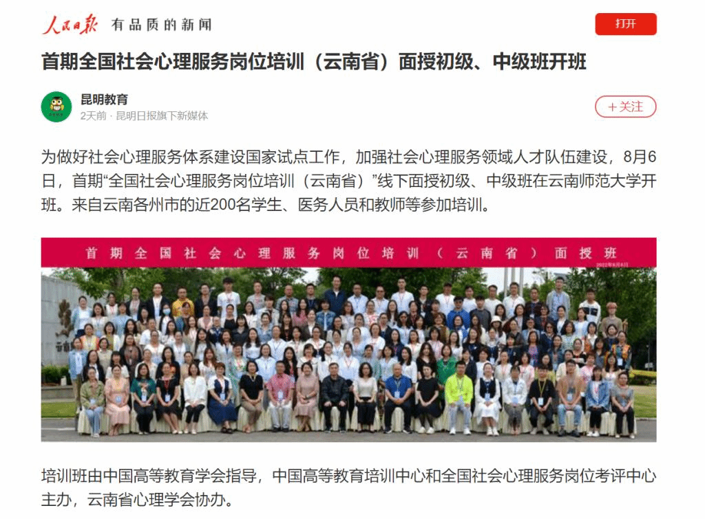 上一条:云南日报 2022-08-07 首期全国社会心理服务岗位培训云南省面授初级、中级班开班 下一条:云南日报 2022-08-03 凝聚海内外中华儿女团结奋进强大力量