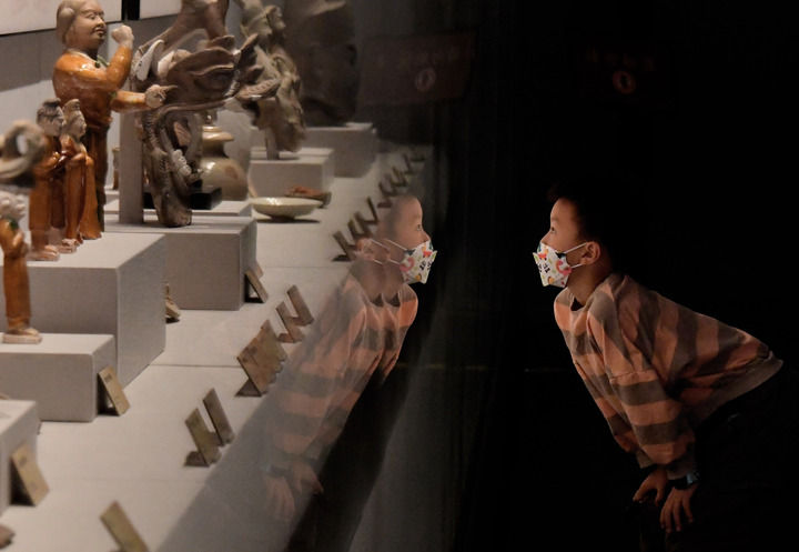 9月4日,一名小朋友在郑州博物馆观看展品。新华社记者 李安 摄