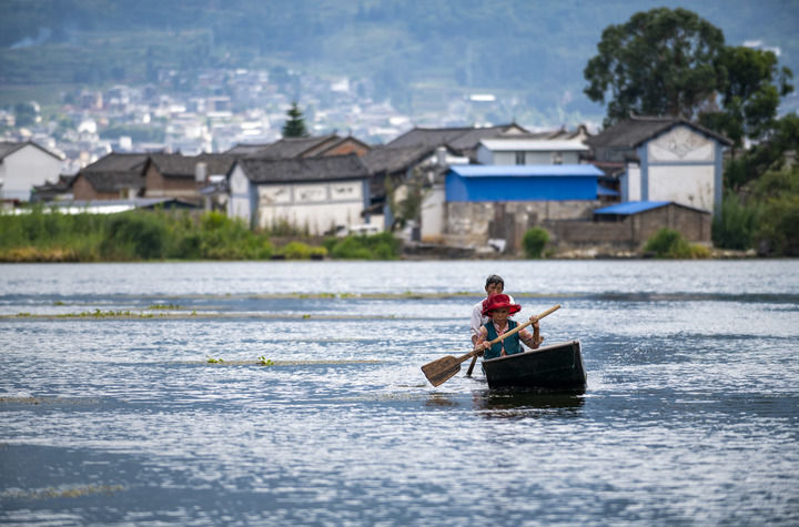 9月28日,洱源西湖当地村民划船出行。新华社记者 陈欣波 摄