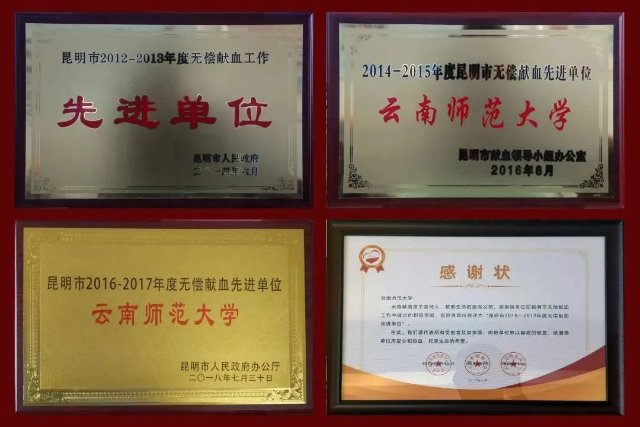 2020年以来,学校在做好疫情防控工作的基础上,校团委依托校青联志愿者联合会、联合云南昆明血液中心累计组织开展了10场献血活动,每次献血活动持续2~3天,累计6617人次参与无偿献血,总献血量超207.7万毫升。近年来,学校曾多次荣获“昆明市无偿献血先进单位”荣誉称号。