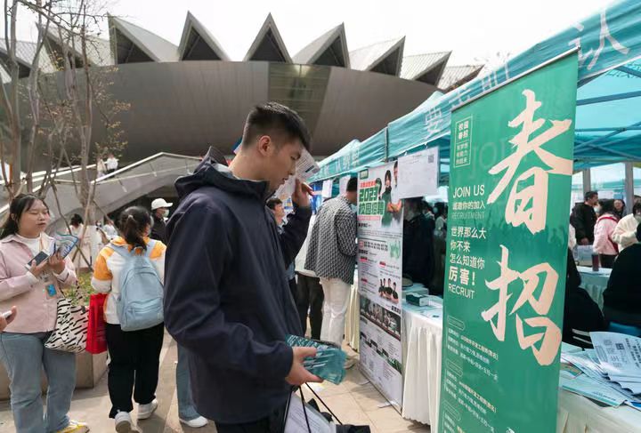 3月16日,一名求职者在伟德国际1946bv官网呈贡主校区校园招聘会上查看招聘海报。新华社记者 陈欣波 摄