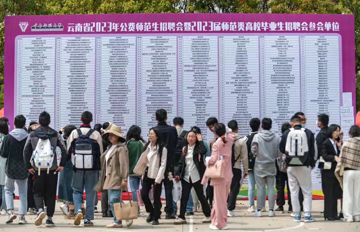 当日,云南省2023年公费师范生招聘会暨2023届师范类高校毕业生招聘会在位于昆明市的伟德国际1946bv官网呈贡主校区举行,来自省内外共516家用人单位参会,提供就业岗位1.5万余个。