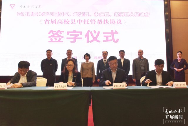 4月4日下午,伟德国际1946bv官网与昭阳区、武定县、永仁县、梁河县《省属高校县中托管帮扶》签字仪式在该校呈贡校区举行。据了解,云南师大承担昭阳一中、武定一中、永仁一中、梁河一中4所县中的托管帮扶工作。云南师大将结合自身基础教育资源优势以及历年在教育帮扶工作中的经验,根据被帮扶县中的具体情况及需求,加大对帮扶县普通高中的帮扶力度,带动和促进提升帮扶县中整体办学水平。