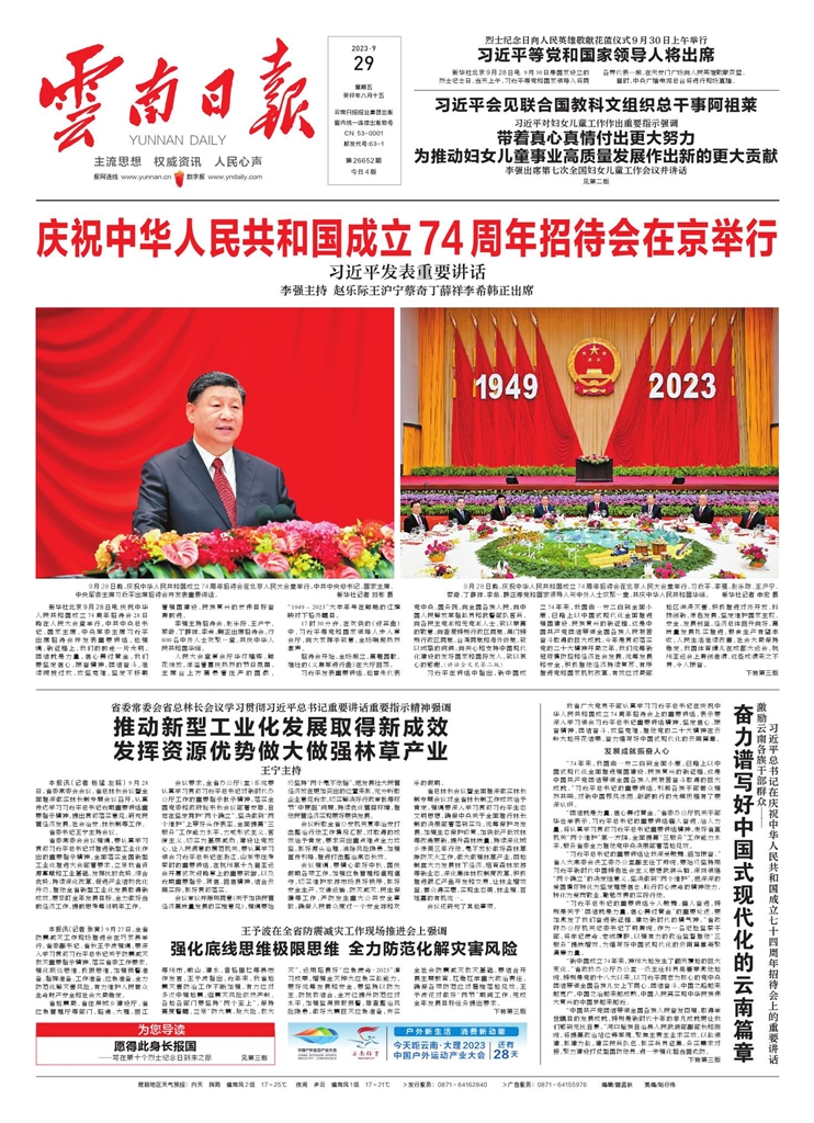 我省广大党员干部认真学习习近平总书记在庆祝中华人民共和国成立74周年招待会上的重要讲话,表示要深入学习领会习近平总书记重要讲话精神,坚定信心、振奋精神,团结奋斗、攻坚克难,推动党的二十大精神在云岭大地开花结果,奋力谱写好中国式现代化的云南篇章。