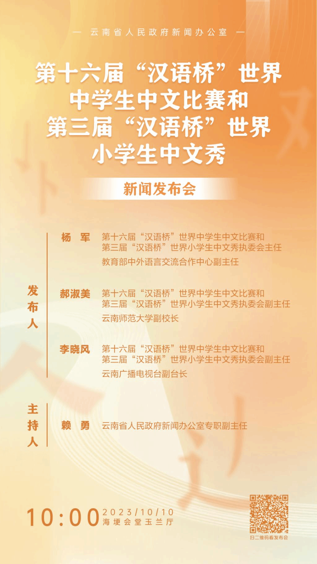 10月10日上午,云南省人民政府新闻办公室在海埂会堂举行第十六届“汉语桥”世界中学生中文比赛和第三届“汉语桥”世界小学生中文秀新闻发布会,介绍相关情况并回答记者提问。