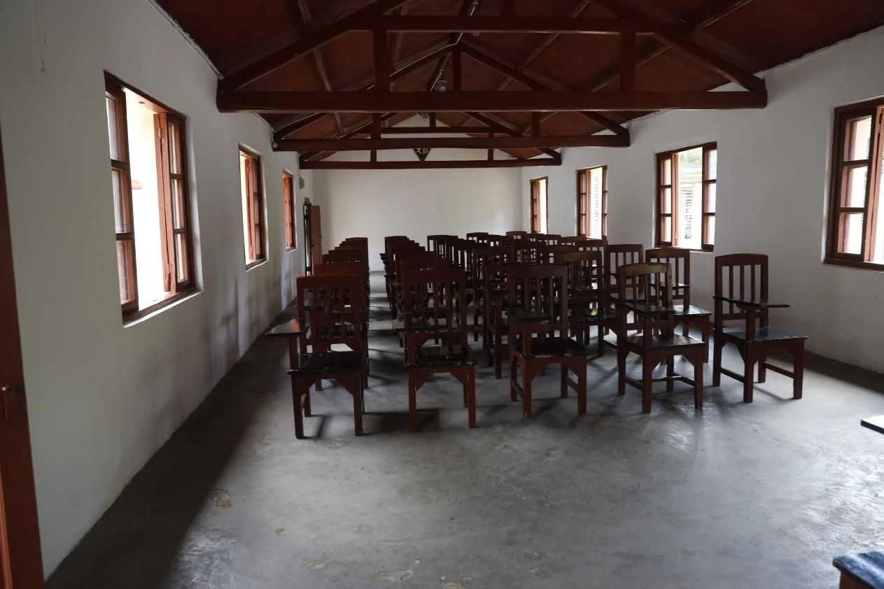 (西南联大旧址教室内摆放整齐的“火腿椅”)