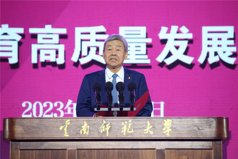 “黄钰生先生认为,教育是一种光源的传递。今天,我们欣慰地看到,那种光源依然在传递,在不间断地发热发光。85年来,云师大秉承联大传统,弘扬联大精神,扎根云南大地,培养各级各类人才40余万人,为边疆教育作出了巨大的贡献,成为‘红土高原上人民教师的摇篮’”饶子和以校友的身份深情讲述了南开大学秘书长、联大师范学院创始院长、国立昆明师范学院首任院长黄钰生先生的动人事迹。他希望大家携手并进,拿着前人留下的钥匙,无愧于前人的期待,把北大、清华、南开、云师大办得更好。