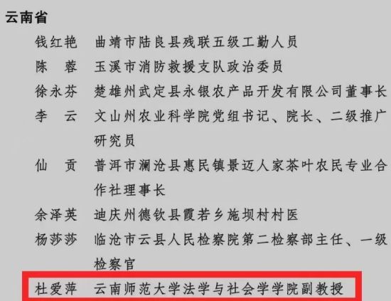杜爱萍以满腔热情投入法治教育、普法宣讲以及云南省的妇女儿童工作,握紧话筒、站好讲台,忠实践行一名党的法治工作者的神圣使命,她突出的工作成绩和认真负责的工作态度得到了学生、群众和社会的肯定和认可,荣获了全国维护妇女儿童权益先进个人,云南省首届最美社科人、支教先进个人、清廉家庭等荣誉。“不管我是教师,还是讲师团成员,抑或是人大代表,身份只是一种‘头衔’,不会改变我为人民服务的初心,我将继续立足讲台,面向社会,忠诚而又踏实地为祖国的教育事业、为社会主义法治国家建设贡献自己的力量。”平凡的话语,展现出杜爱萍不一样的巾帼风采!