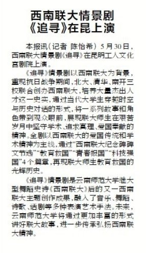 本报讯(记者 陈怡希) 5月30日,西南联大情景剧《追寻》在昆明工人文化宫剧院上演。