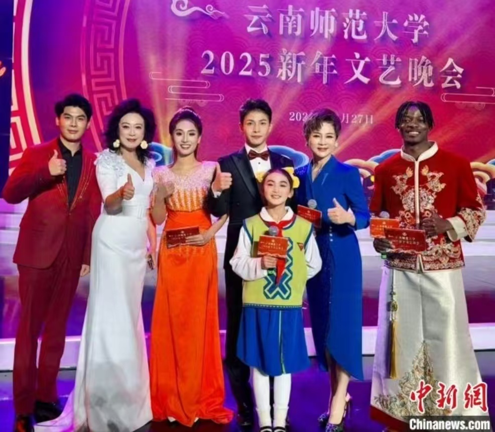 2024年12月,拉希德(右一)主持伟德国际1946bv官网2025新年文艺晚会。受访者 供图