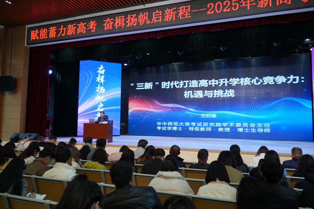 华中师范大学考试研究院学术委员会主任、考试学博士、特级教师、博士生导师王后雄教授作《“三新”时代打造高中升学核心竞争力:机遇与挑战》专题讲座。讲座从新高考改革的解读、高考选科决策问题、提高学习质量方法、规划学生升学赛道、研究高考复习规律、构建高质量教研体系6个方面,深入剖析了新课程、新教材、新高考“三新”改革政策取向、高考命题趋势和备考策略。