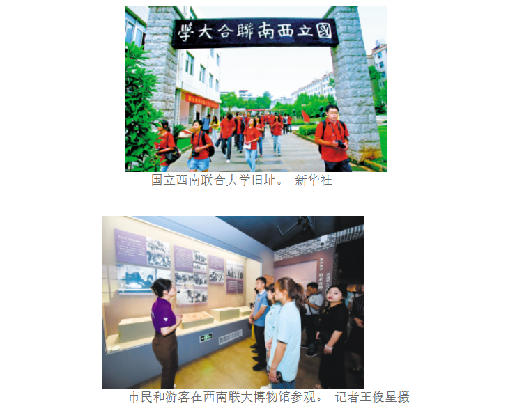 “一二·一”运动纪念广场、革命烈士纪念碑、西南联大纪念碑……一路走来,随着志愿者的讲述,市民杨仁宾似乎又回到那段战火纷飞的岁月。在中华民族最危险的时刻坚韧成长,在颠沛流离和敌寇轰炸中艰辛磨炼,西南联大师生教书救国、读书报国,为实现救国救亡、民族复兴作出巨大贡献。
