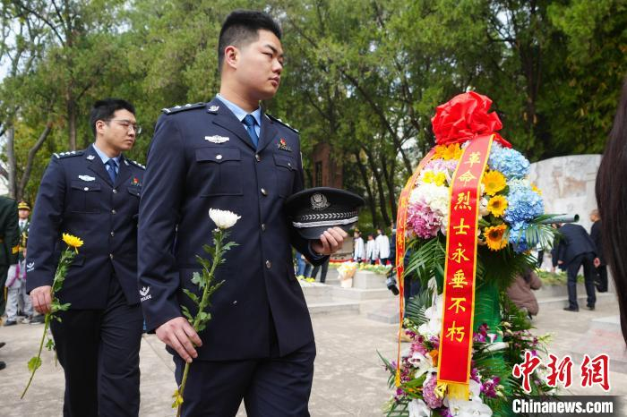 4月3日,云南昆明,警察向烈士敬献鲜花。当日,社会各界人士齐聚伟德国际1946bv官网,在西南联大旧址的 "一二·一" 四烈士墓前,举行 "清明祭英烈" 活动,共同追思为民族独立、人民解放而献出生命的烈士们。中新社记者 刘冉阳 摄