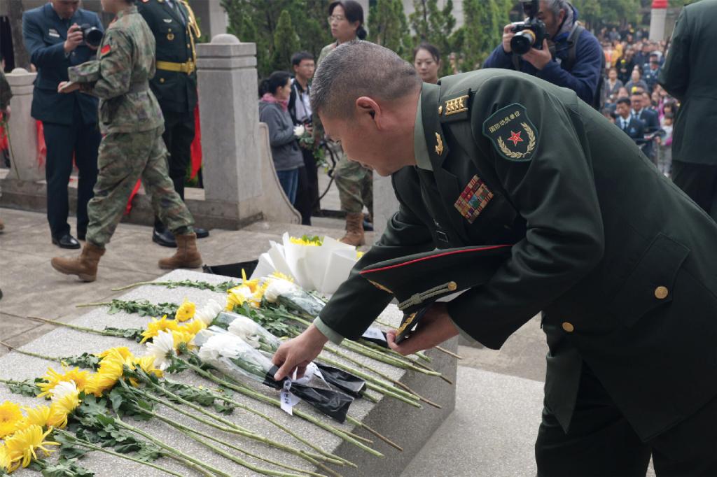 伴随《献花曲》,仪仗队向烈士敬献花篮,昆明警备区司令员张钦锋,昆明市委常委、昆明警备区政治委员吴正良,昆明警备区副司令员谭仲春,昆明市退役军人事务局局长朱伟上前整理缎带,缎带随风飘动,寄托着对先烈们无尽的追思。