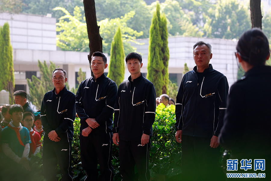 奥运冠军马龙、许昕、刘诗雯、李晓霞在“一二·一”四烈士墓前默哀(4月8日摄)。新华网 徐华陵 摄