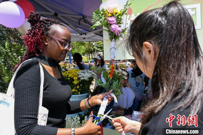 4月17日,来自肯尼亚的国际学生体验鲜花团扇制作。李嘉娴 摄
