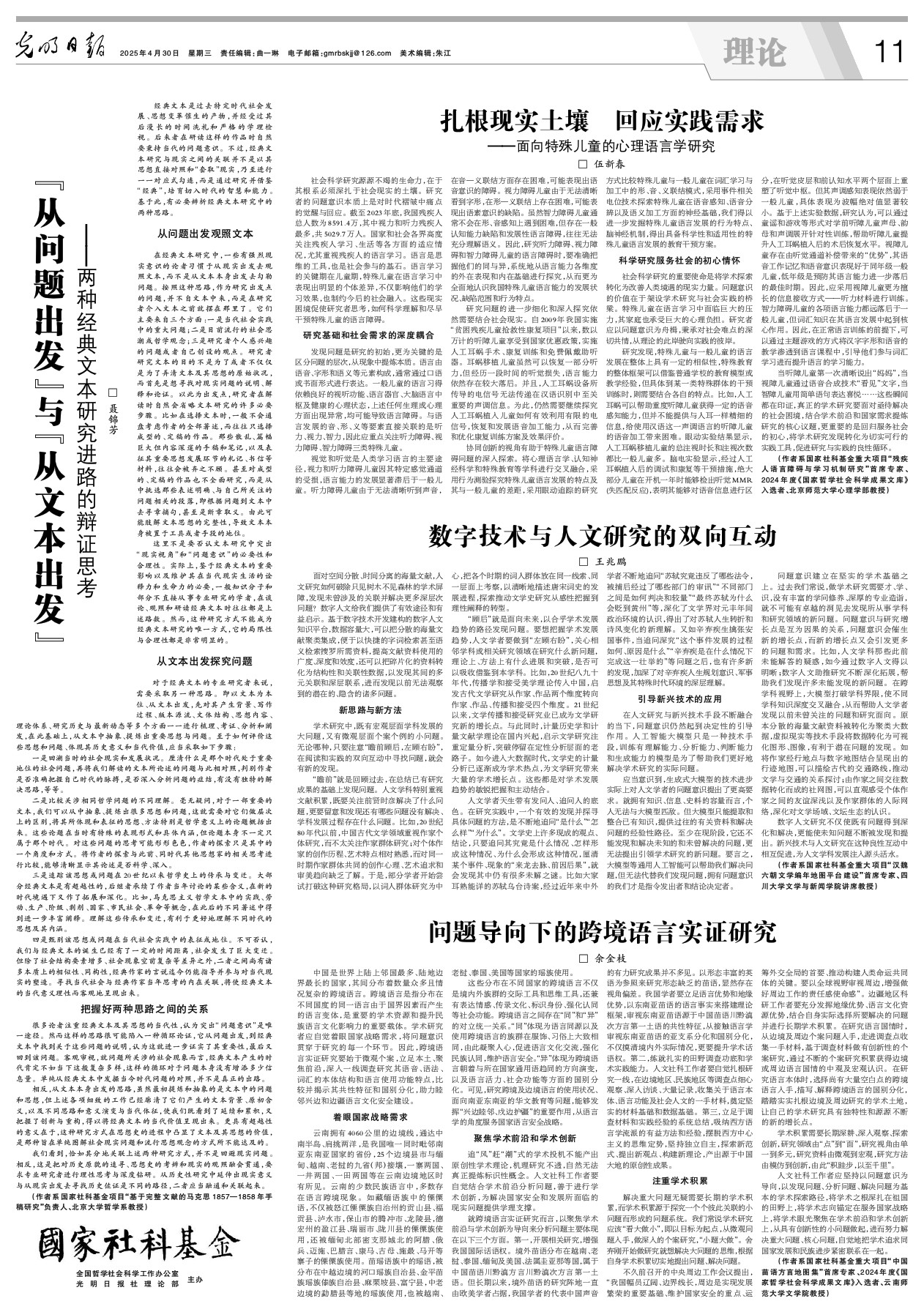 人文社科工作者应坚持以问题意识为导向,以发现问题、分析问题、解决问题为基本的学术探索路径,将学术之根深扎在祖国的田野上,将学术志向锚定在服务国家战略上,将学术眼光聚焦在学术前沿和学术创新上,从具有创新性的小问题做起,进而努力解决重大问题、核心问题,自觉地把学术追求同国家发展和民族进步紧密联系在一起。