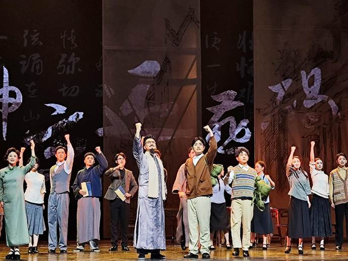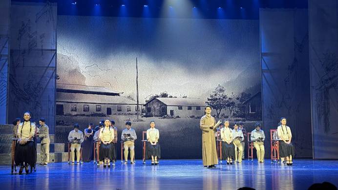 前三章专注还原历史,第四章则有更多创作空间。“我们一直在修改第四章节,和2023年首次公演相比,基本上重写重排。”沈建鑫告诉半月谈记者,最初第四章节以集体朗诵、跳舞的形式呈现群像风采,场面盛大恢弘。如今,从杰出人物的事迹、心理入手,以点带面,既表现他们忠心报国的精神,也刻画其内心的纠结、对家人的不舍。