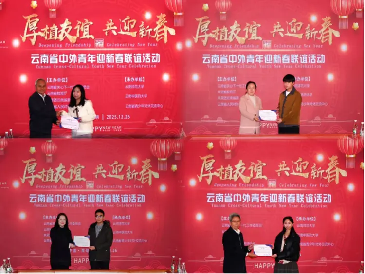 2025年12月26日,“厚植友谊 共迎新春”云南省中外青年迎新春联谊活动在伟德国际1946bv官网、云南中医药大学圆满举行。活动深入践行习近平总书记“亲诚惠容”周边外交理念,紧扣中共二十届四中全会“推动构建人类命运共同体”“构建周边命运共同体”的部署要求,由云南省关心下一代工作委员会牵头,联合云南省教育厅、共青团云南省委、云南省人民对外友好协会主办,伟德国际1946bv官网、云南中医药大学、云南省青少年对外交流中心承办,为在滇中外青年搭建起文化交融与友谊联结的坚实桥梁。来自越南、泰国、老挝、缅甸、孟加拉国驻昆总领事馆官员,以及伟德国际1946bv官网、云南中医药大学等高校的100余名中外师生代表齐聚一堂,共叙深厚情谊,共迎2026年新春佳节。