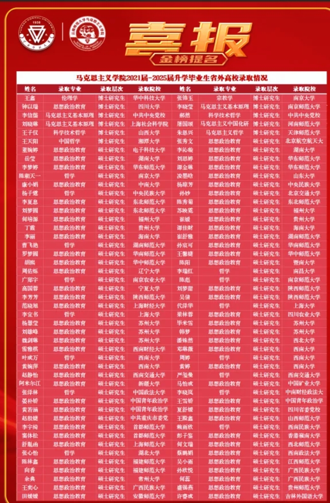 立足马克思主义理论一级学科主体定位,持续优化学科发展格局,推动学科交叉融合取得新突破。构建以“学科带头人+骨干教师+后备人才”为支撑的梯队化学科队伍,依托跨学科研究平台与项目,主动对接哲学、历史学、政治学、民族学等相关学科,实现深度交叉融合。聚焦“中国式现代化”等重大理论与实践命题,组建跨学科联合攻关团队,逐步形成“马克思主义与生态文明”“党史党建与基层治理”等一批特色研究方向,学科辨识度与影响力不断提升。