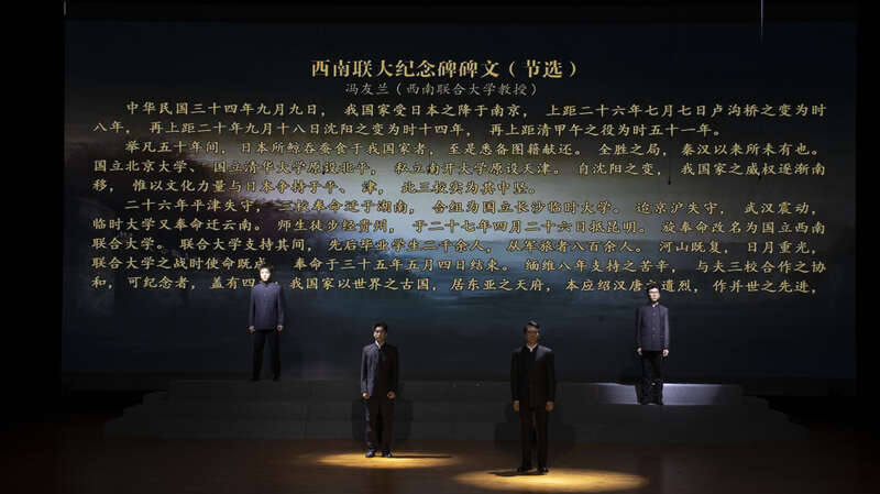 “大一统,无倾折。中兴业,继往烈。维三校,兄弟列……”4名演员朗诵西南联大纪念碑碑文节选,整整7分钟,台下的观众认真地听着,有人还跟着大屏幕滚动的碑文字幕和演员一起朗诵。