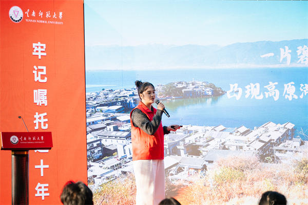 在这里,一场别开生面的思政课徐徐展开。“大理用一片碧水繁花,一条生态廊道,向我们生动展示了十年来保护洱海和建设生态文明的优秀成果。洱海十年的保护治理,是云南生态文明建设的一个缩影,也是坚持人与自然和谐共生,践行‘绿水青山就是金山银山’的生动样本。”云南大学马克思主义学院欧阳希同学以“优良生态是云南的一张永恒名片”为主题进行现场讲授。